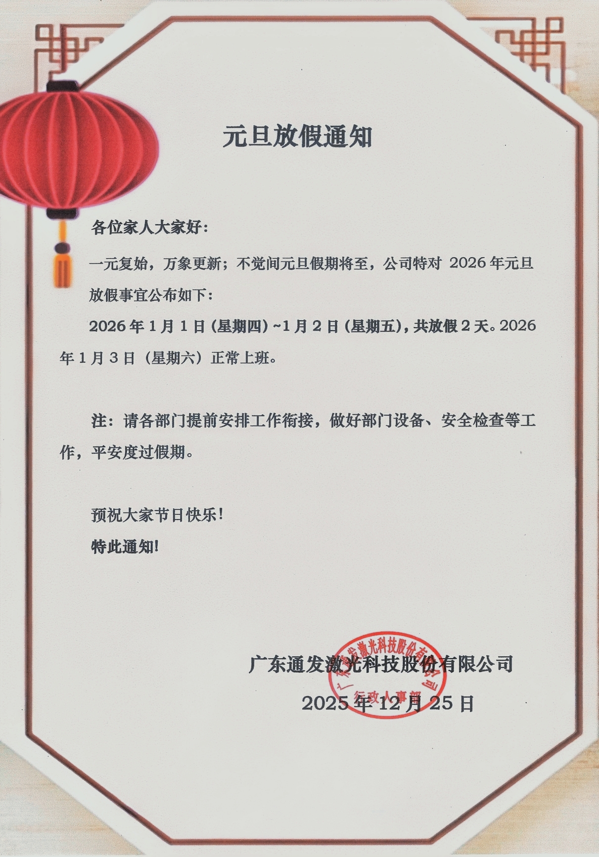 通發(fā)激光2026年元旦放假通知