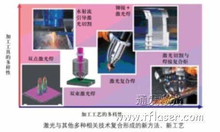 就拿激光焊接技術來說,在激光復合工藝的發(fā)展中已出現(xiàn)了如雙點或雙束激光的復合、激光與電弧的復合、激光與攪拌摩擦熱復合以及激光與電阻熱復合等形式;并呈現(xiàn)與其他相關技術結合及功能延伸的趨勢,如與水射流、鉚接等結合而形成的新工藝(見圖)。