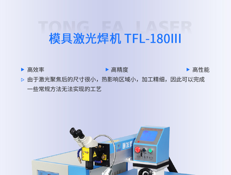 普通型模具激光焊機(jī)TFL-180Ⅲ是通發(fā)激光公司的模具激光焊機(jī)中銷(xiāo)量較大的傳統(tǒng)型,配置激光頭手搖升降與工作臺(tái)按鈕電動(dòng)升降實(shí)現(xiàn)焊接不同厚度模具的激光焊加工。本系列機(jī)型適用于各類精密注塑模具激光補(bǔ)焊、壓鑄模具激光修補(bǔ)焊接;同時(shí)也適合鑄件沙孔激光修補(bǔ)、模具磨損激光修復(fù)、過(guò)切加工等的激光修補(bǔ);各類金屬結(jié)構(gòu)件激光焊接加工、金銀首飾激光焊接加工。