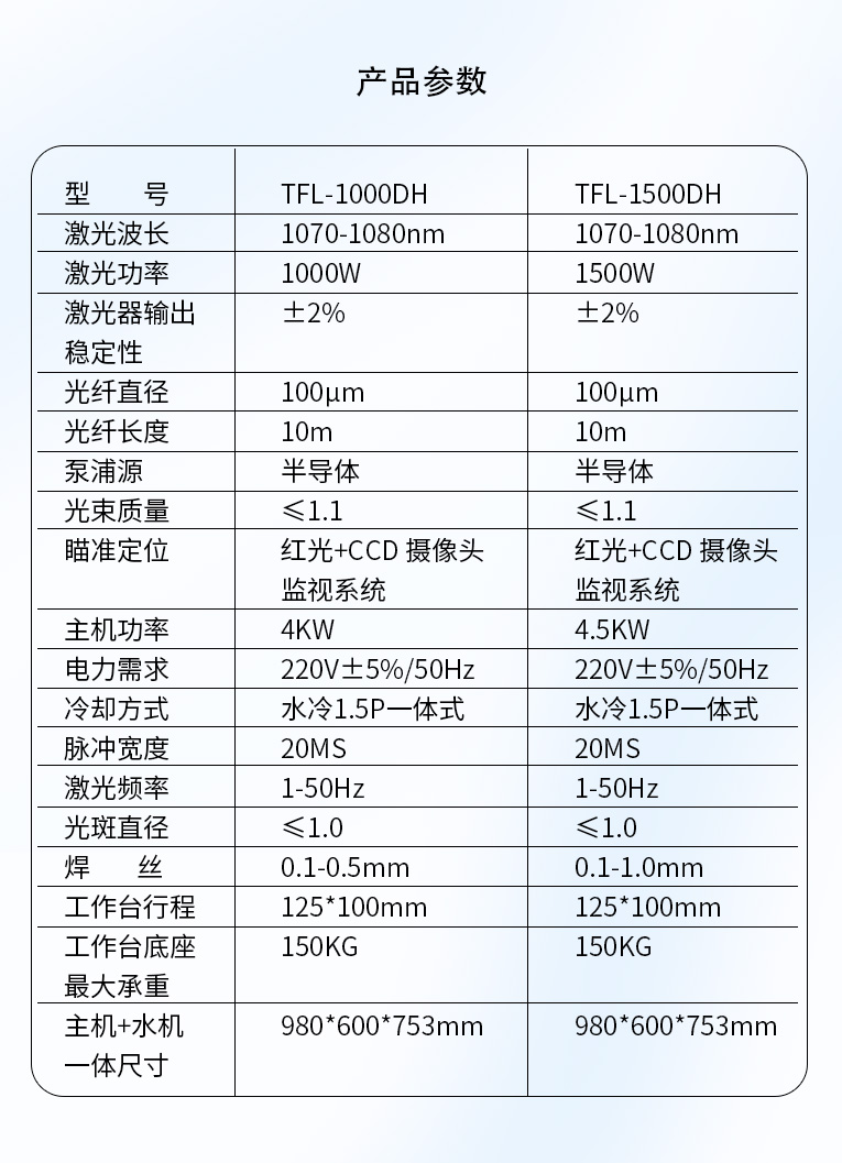 采用光纖激光器,反射率高,能量強(qiáng),免維護(hù),免調(diào)光,功耗少,相比傳統(tǒng) 模具焊來(lái)說(shuō),體積小,安全,穩(wěn)定性好超長(zhǎng)使用壽命。 1000W光纖激光器,滿足銅、鋁焊接量大的模具及產(chǎn)品焊接加工需要。 高承重底座及工作臺(tái),保持輕便靈活的優(yōu)點(diǎn),同時(shí)提供更高承載能力。 配備.1.5P大功率一體式水冷水機(jī),保證了大功率焊接的穩(wěn)定性。
